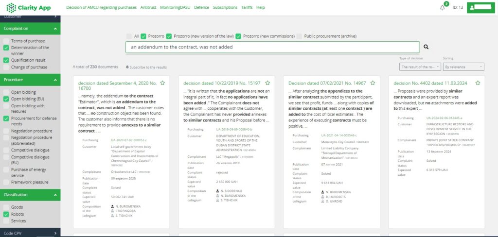 The Clarity App is designed to help vendors win appeals. The service works on a subscription model and provides access to the AMCU’s online database. Users can get a full-text search for any appeal decisions via a Google-like interface by entering keywords in the search box, including additional filters, such as date, status of complaints, or complaints by certain complainants, buyers, or procedures. In addition, users can save a library of decisions and subscribe to updates for certain appeals. So before filing a complaint, a business can search previous decisions by the procurement review body in similar cases and understands how to build a winning appeal.