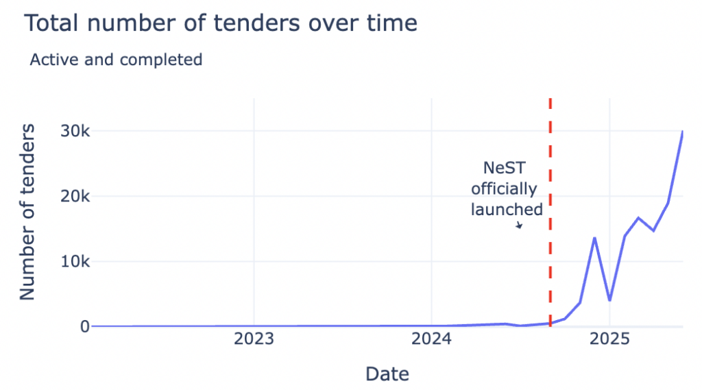 According to the publicly available data analyzed by OCP, the number of unique procuring entities publishing tenders on NeST increased from 9,000 in 2024 to more than 22,500 (or from around 15% to 35% of buyers).