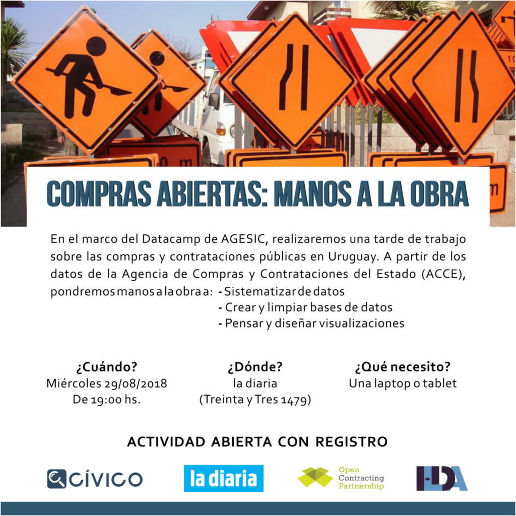 En el marco del Datacamp de AGESIC, realizaremos una tarde de trabajo sobre las compras y contrataciones públicas en Uruguay. A partir de los datos de la Agencia de Compras y Contrataciones del Estado (ACCE), pondremos manos a la obra a sistematizar datos, crear y limpiar bases de datos, y pensar y diseñar visualizaciones.