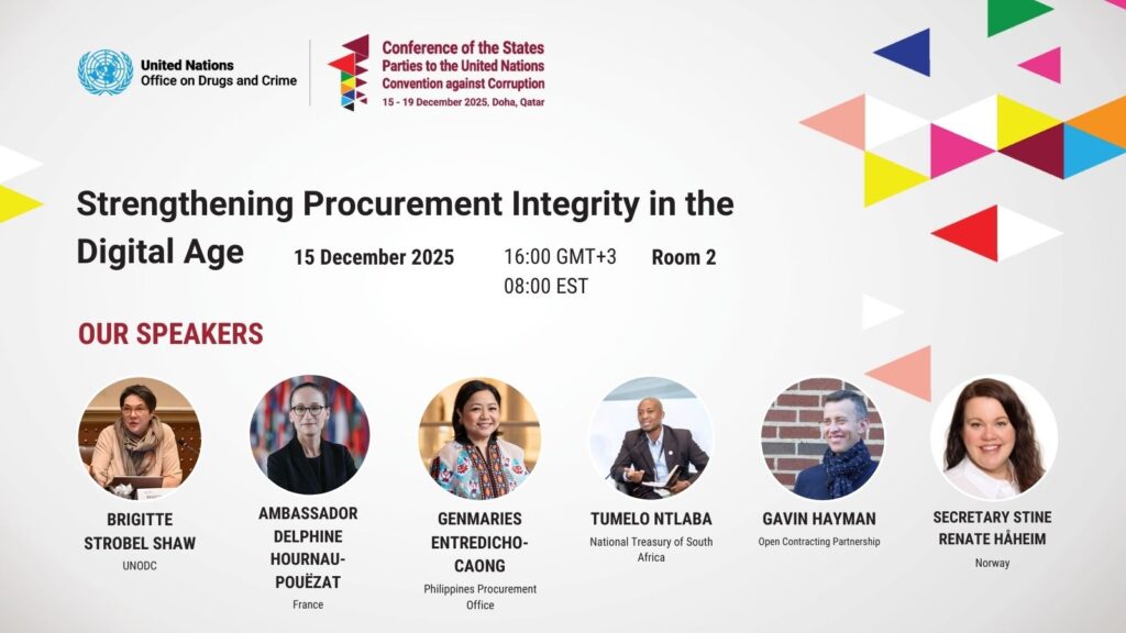 Join us for the launch of the NEW UNODC guidelines on using technology to prevent and combat corruption in public procurement. We will be joined by our partners from France, Norway, South Africa, the Philippines and the UN Office on Drugs & Crime.
