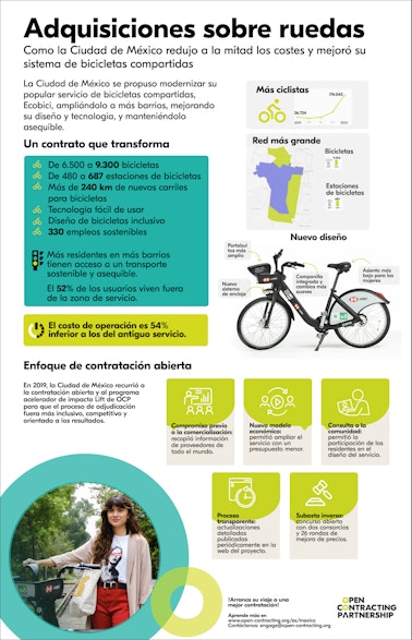 La Ciudad de México se propuso modernizar su popular servicio de bicicletas compartidas, Ecobici, ampliándolo a más barrios, mejorando su diseño y tecnología, y manteniéndolo asequible. En 2019, la Ciudad de México recurrió a la contratación abierta y al programa acelerador de impacto Lift de OCP para que el proceso de adjudicación fuera más inclusivo, competitivo y orientado a los resultados.
