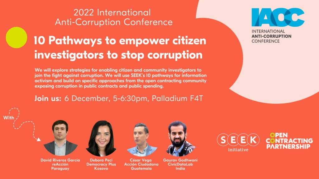 Meet us at the IACC as Open Contracting Partnership will share our insights from supporting partners in government, civil society and journalism. Open contracting’s four cornerstones of outcome-driven, data-driven, participatory and sustainable procurement serve as a framework for change.